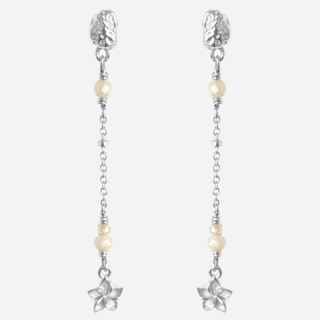 Ivy øreringene er designet med ægte ferskvandsperler samt en lille, svag lyseblå, zirkonia sten, som funkler når lyset rammer den. Øreringene er inspireret af eksotiske blomster og organiske former. Ivy er enkle, feminine og perfekte til at stacke med andre øreringe. De skaber længde og femininitet til dit look.